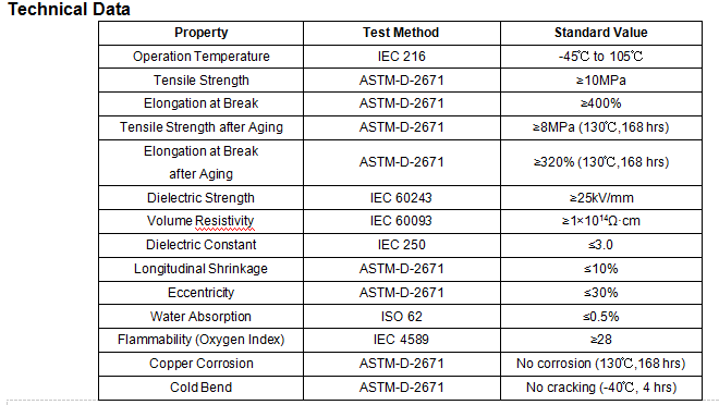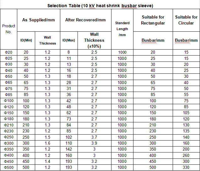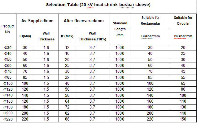 Raychem busbar high voltage heat shrink sleeving and tubing equivalent is made from radiation crosslinked halogen free compounds. Specially designed formulation makes the tubing to have excellent electrical, shrinking and anti-tracking properties. The tubing is suitable for application in insulating voltage busbar up to 15KV. The tubing shall be homogeneous and essentially free from flaws, defects, pinholes, bubbles, seams, cracks and inclusions.